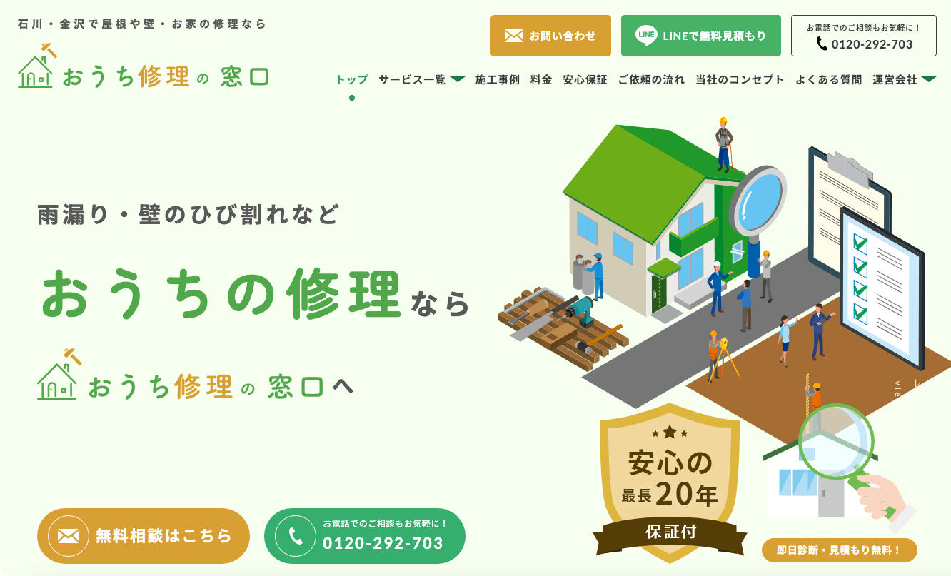 このたびソラノデザインでは、石川県・金沢エリアを中心に住まいの修理相談を受け付ける「おうち修理の窓口」様のWEBサイト制作を担当させていただきました。